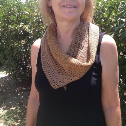 This lovely shawlette is an asymetrical triangle, worked in garter stitch with mesh/lace detail. It measures 68" in length, and is 11" at its widest point. Uses 1 skein of Cascade Heritage Wave (fingering) in a brown tonal which resembles a Tigereye gem.