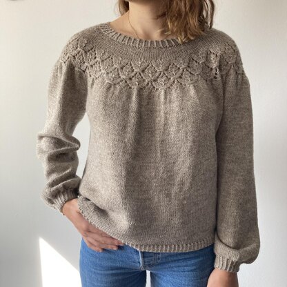 Tilbaka is a top-down sweater worked in the round, seamless with a pretty lace pattern.