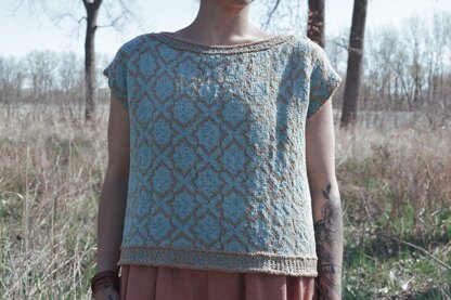 The Tile Tee is a cotton stranded color work tee inspired by a cross and star tile pattern. The design starts off at the bottom edge knit in the round. At the armholes the top portion is worked separately flat. Shoulders are seamed and stitches are picked up for the armhole and neckline finishing. The neckline and bottom edge feature two-color syncopated ribbing. The Tile Tee has a relaxed, easy fit with 4-8” / 10-20.5 cm positive ease in the. bust forKnit up in Quince and Co. Willet cotton yarn, this design is great for spring through fall!