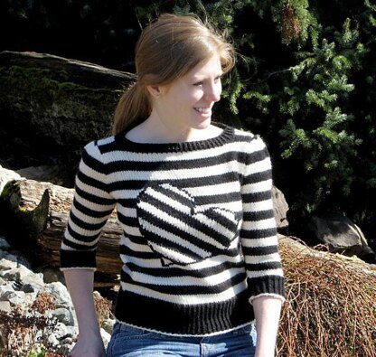 The heart motif is a little tricky, and can be completed in two ways – charts are provided for both. It can either be worked in its entirety onto the front using an intarsia or stranding technique; or the general shape of the white heart can be worked in intarsia, with the detailed outline and diagonal striping worked in duplicate stitch afterwards.