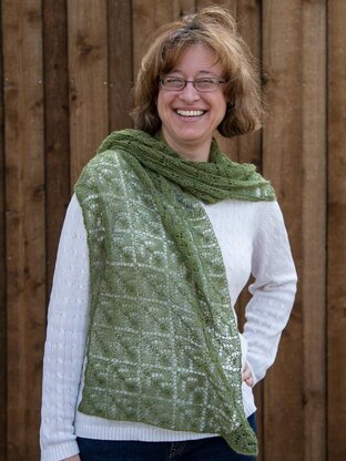 This lacy wrap is knit on a bias, so it has a slight parallelogram shape. It's the perfect accessory to a sundress or tank in the summer or for a light wrap in the fall and spring.