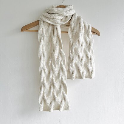 The scarf starts with a 1x1 ribbing cast-on, followed by an all-over cable motif and finished with a sewn bind-off.