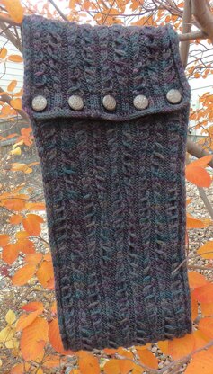 This cowl (and the matching hat) has cables that oscillate (with hidden increases and decreases) like travelling through the Time Vortex in the Tardis. And you can customize your cowl with fun buttons.