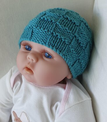This 8ply Beanie is worked in an easy block stitch. This design will suit either a baby girl or boy.