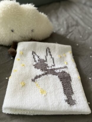 A lovely baby blanket featuring Tinker-bell, the fairy, with a lace border. The pattern uses white for the background, with small amounts of grey and lemon, but it’s up to you.