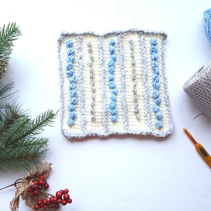 This pattern is for a winter-themed tunisian crochet square that is worked in panels and joined so it does not require a Tunisian crochet hook. Then surface bobble stitches are added using worsted weight yarn and metallic crochet thread to give some fun texture. The whole project can be completed with a regular crochet hook making it the perfect beginner project!