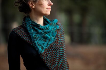 Tiny Birds is an asymmetrical triangle wrap with an unusual stitch pattern designed to interweave the colours of a busy variegated yarn in fascinating ways. It begins with a crossover stitch which is later contrasted by a unique 2 coloured lace mesh edge which then breaks up the variegated colours and allows each to shine.