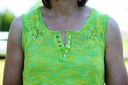 This easy top is fresh and breezy with its lace-trimmed hem, Henley-style buttoned neckline, and A-line shaping. The cotton-bamboo blend yarn is perfect for warm weather, making this a welcome addition to your summer wardrobe. The top is worked bottom up, in the round, separating at the armholes to work the front and back separately. Narrow bands of garter stitch edge the neck, armholes, and hem.