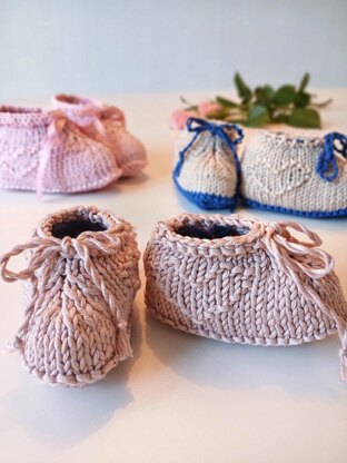 The pattern includes sizes from newborn to 12 months and provides detailed instructions for knitting both flat and in the round. A subtle heart motif, made with purl stitches, is found on both sides of the shoes. Use twisted strings or ribbons for the shoes to stay put.