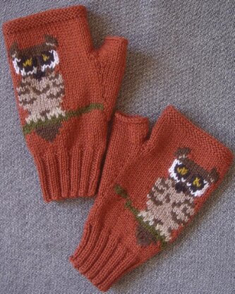 PDF knitting pattern for a pair of fingerless mitts/gloves with a Tiny Owl sitting on a branch on the front of each mitt. The backs of the mitts are plain.