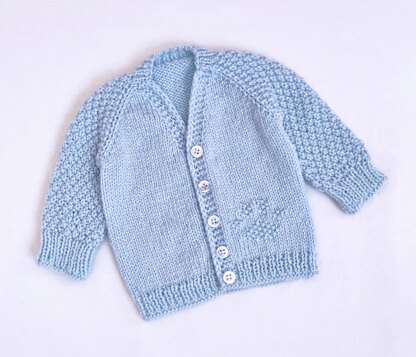 This sweet baby cardigan knitting pattern features an open front, a classic V-neck, and raglan sleeves. It is knit flat from the top down, with no seams required. The sleeves are worked in the round and a tiny paw detail on the left front adds a charming touch.