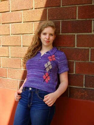 This sweater is inspired by a vintage photo for a knit pattern from 1951. Tippi Hedren in The Birds might have worn a top like this, on its own or under a suit jacket. It has a soft collar, buttoned neck, folded cuffs, and ribbing at the waist. It is knit in stockinette with a stylized argyle design down one side only. This is a modern interpretation of a vintage look.