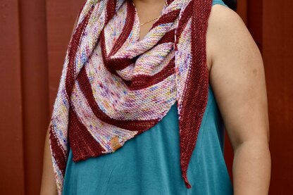 Tircha (meaning angled or biased in Hindi), is a total stash buster scarf/shawl. Use any weight of yarn at any gauge from your stash and you can make either a scarf or a complete shawl, depending on your yardage. Use 1, 2, 3 or as many colours as you want. The sample shown in the picture uses 1 hank of our Cozy Shawl base in Satrangi colourway and a partial hank of Knit Picks’ Shimmer hand dyed lace yarn held double in their Sherry colourway.