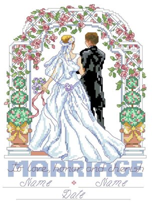 Designed by: Linda Gillum. Relive the day of new beginnings with this elegant marriage design from your wedding or anniversary celebration. The happy couple walks through a floral filled arch, with formal topiaries standing watch. Features the words "To Love, Honor and cherish" and can be personalized with your names and wedding date. Perfect for yourself or as a cherished gift.\n