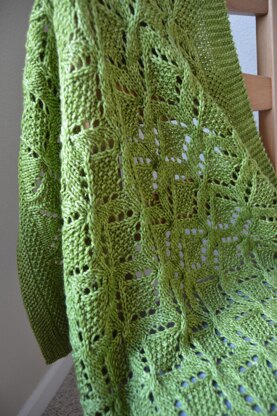 Sized at 26' by 39" blocked. Blanket is worked in one piece and can easily be changed by adjusting the 12 st, 28 row pattern repeat. For width, adjust your cast on stitches in increments of 12 st.