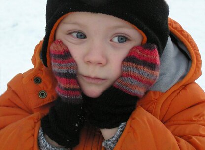 Use leftover self-patterning sock yarn paired with a solid from your stash to knit these fun Fair Isle-like mittens. Six mitten sizes range from newborn to big kids.