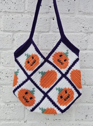 This crochet bag consists on a written pattern as well as a chart for each pumpkin, the plain pumpkin and the pumpkin with a face. You work the pumpkin squares up with Intarsia crochet but you can use tapestry crochet if you prefer. This may add a little bulk to the square but should not affect it too much.