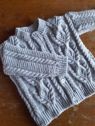Toddler cardigan with cables and garter stitch detail, age 12-18 months, 22" chest. Actual size 24" chest, 13" length, 8.5" sleeve.