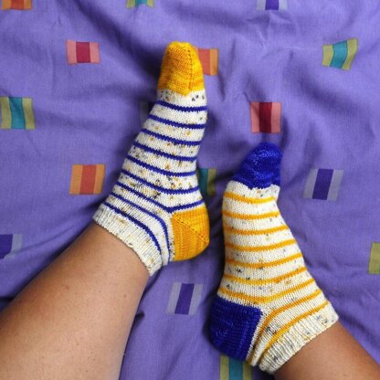 Learn to knit a classic pair of socks from toe to cuff with this pattern and video tutorial. The socks are worked using the two circulars method for knitting small circumferences in the round. They have a mock short-row toe and heel worked in contrasting colors, a striped Stockinette stitch foot and leg, and a k1p1 rib cuff finished with a sewn bind-off. The accompanying video tutorial walks through each of these steps in detail.