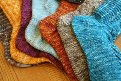 This pattern offers you a template for toe up socks with traditional heel flap and gusset construction in seven sizes with many options, including different yarn weights, high instep option, and others.