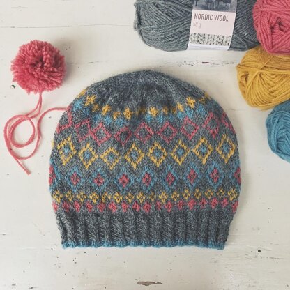 Tofane hat features fine, graphic stranded pattern repeat. It starts with a 2/2 ribbing with a little cable. Top it with a pompom if you like.
