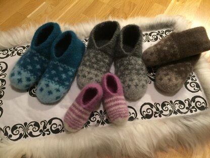 Disse tøflene går det fort å strikke. Mønsteret er veldig enkelt. Strikker man de ensfarget eller med striper, kan det være en grei oppgave for et barn også. Her har man også mulighet for å få bruke opp restgarn som man har liggende.
