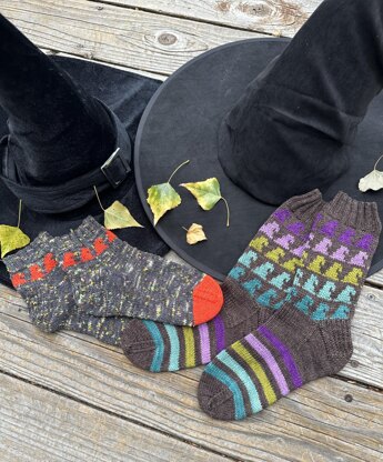 This sock was designed to use a sock set by Moonglow Yarn Co, ‘Toil and Trouble’. It utilizes the 5 minis in a fun witchy hat pattern down the leg, and then some optional fun stripes on the foot.