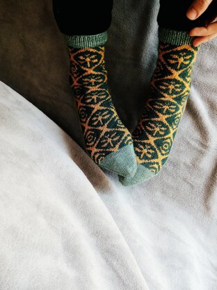 Contrast color 2 (gold): 120 meters / 29 grams Socks Yeah! by CoopKnits (75% Merino, 25% Nylon; 211 meters / 50 grams) in the colorway Sphene