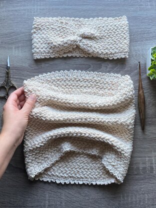 These deceptively simple crochet patterns yields a cozy yet elegant ear warmer and cowl set, great for those chilly days when you want to be toasty warm AND stylish!