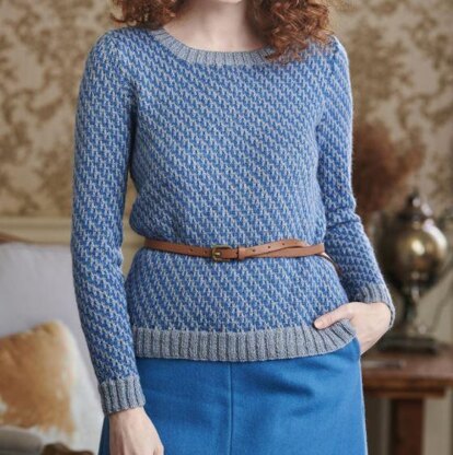 This is a pattern for a tongue and groove jumper, originally published in The Knitter. It is a close fitting shape with a two colour slip stitch pattern, rib edgings. Photos The Knitter.