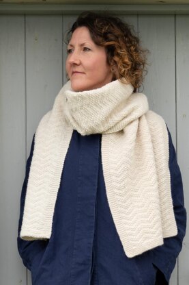 This scarf and stole uses an allover zigzag textured pattern creating an interesting fabric that is repetitive yet interesting to knit. It uses the same pattern as the Toonsmal hat. Toonsmal is the Shetland name given to the collection of fields (toons) within a croft.