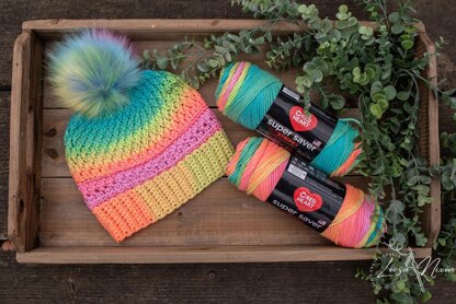 Materials:– Any size 4 yarn will probably work – Size I/9-5.50mm Crochet Hook and Size J/10-6.00mm and an H/8-5.00mm for the brim – Tapestry Needle – Faux Fur Pompom, or a pompom maker. – Sewing needle and thread for attaching the snap for the pompom - Stitch marker to use at the beginning stitch of the round to make it easier to find.