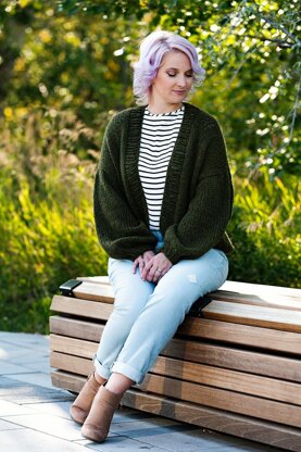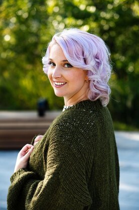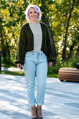 This cardigan design is an oversized, cropped “Bomber jacket” that hits right at the natural waistline. It’s been designed with roughly 6-8 inches of positive ease and with flowy bishop sleeves. So get out your aviators and rock this cardi with some ripped jeans, sneaks and a top knot. You’ll be the coolest cat in town.
