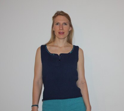 300 (300, 350)g knitting yarn, cotton 120 m/50g (131 yd/50g) or another yarn which gives you the gauge 18 sts/27 r = 10 x 10 cm (4" x 4") 3 smaller buttons, a piece of contrast color for embroidery.