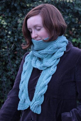 The garter stitch curved section is knit from the top down, and is shaped with short rows. The reversible cable edging is then knitted-on. The pattern is written in two sizes, and includes written and charted instructions. This scarf is best suited to springy, soft yarns as the 12x12 stitch cable can be quite tight to work. The pattern is written using the Japanese short row technique; German short rows would also work.