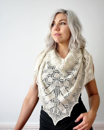 This shawl is worked from the top down, beginning with a garter tab. Every right side row is increased by four stitches. Both written and charted instructions are included. More or less Main Body repeats may be worked to increase or decrease the size of the shawl.