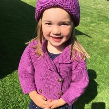Double-breated jacket and hat in garter stitch, knitted in soft merino wool. Front- and back panels are knitted in one piece, so there are no side seams to sew. The pattern also includes photos, sketches of all pattern pieces and a list of abbreviations. The cardigan can be machine washed using a wool program.