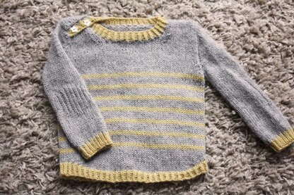 Tout Petit Large is knitted in the round, seamlessly from the bottom-up. Set-in sleeves are picked up directly on the armholes and shoulders are shaped with short rows. This timeless sweater is spiced up by an asymmetrical and buttoned envelope neckline and textured elbow for the very little sailors in your life!