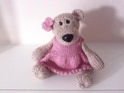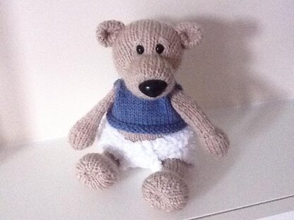 This little bear sits at 5-6 inches high. you can make it into a girl or boy. No gauge needed as it is a toy. I have used DK weight yarn and 3mm needles but worsted weight would work fine just change the needle size. This is my first pattern. Hopefully you will enjoy making it.