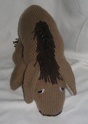 A gloomy donkey to knit. Poor old thing needs cuddling to make him happy! Make him in brown or grey – or one of each, so they can grumble at each other! Use your choice of DK/8 ply yarn: grey or mid brown x 80 gms, fawn or cream x 10 gms for inner ears, dark brown x 10 gms for mane and tail. He is made in two main pieces, seamed together like a fabric toy. The sample has sew on eyes but please use safety eyes with click-on backs for children 3 years or younger.