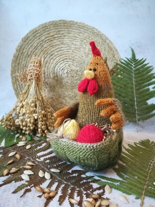 Toy knitting patterns, rustic chicken toy pattern, Easter amigurumi, knitted chicken with egg basket