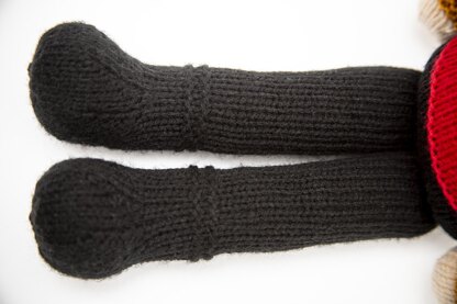 He is worked flat on 3mm straight needles with seams. He is made with DK yarn and is a great advanced beginer project. A knowledge of simple colour changes, increases and decreases will be needed for this project.
