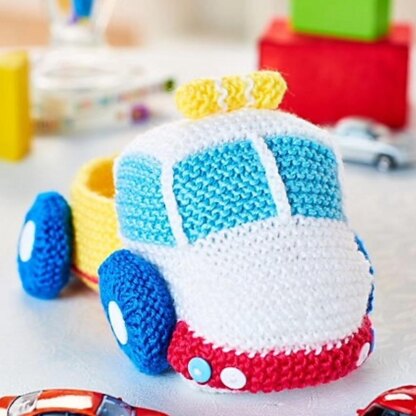 This knitted truck has a trailer on the back to store toys, or perhaps some candy and treats for cargo. For advanced beginner and intermediate knitters, the truck is knitted using short row shaping in garter stitch. The wheels are knitted separately and sewn on after making up. Designed by Amanda Berry @fluffandfuzz, the truck is knitted in acrylic DK yarns on single pointed needles (not in the round). The crochet hook is used to work single crochet chains for the window struts. For intermediate knitters and above, other techniques used include casting on and off, knits, increases and decreases, knitting stripes, and seaming to finish.