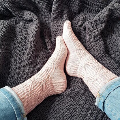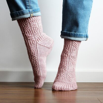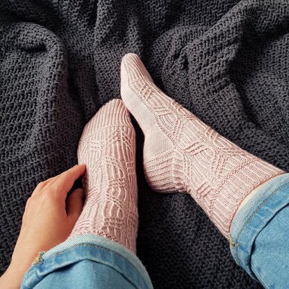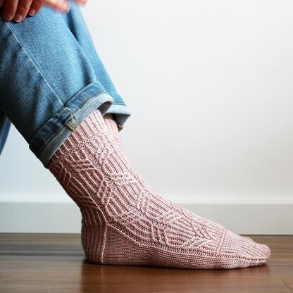 These beautiful socks feature a fascinating cable-twist-stitch motif, which decorates the leg and then gracefully runs down the top of the foot.