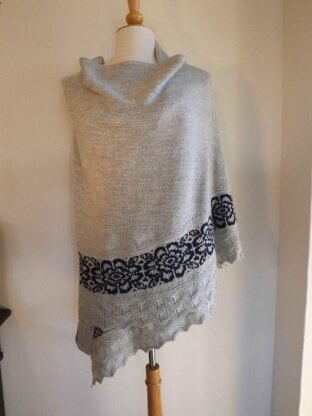 The Traditional Flower shawl is a shawl that have long ends that will drape gracefully around the shoulders and keeps in place without a pin. The shawl is knitted in one piece starting at the outside edge of the shawl. The shawl has a 2-color stripe worked in stranded knitting with a traditional Scandinavian flower pattern.
