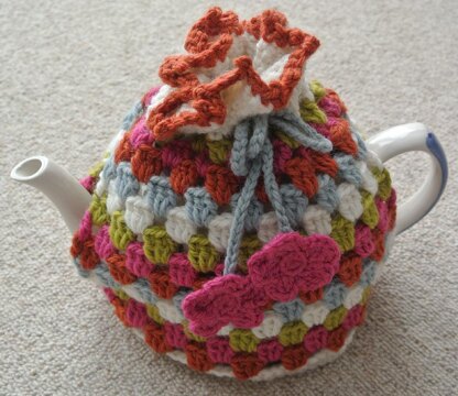 This is a pattern for a tea cosy, part of the Make at Home Range of knit and crochet patterns for the home. The stitch is the one used for granny squares. The tie has a crochet flower at each end. The yarn used is Drops Alaska and Nepal, but can be substituted for any aran weight yarn worked to the same tension. This will fit an average sized teapot.