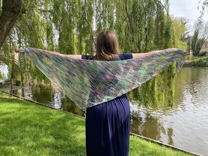 Trail and Blaze is a one skein shawl designed to make the most of a skein of colourful 4ply or sock yarn with stretches of smooth stockinette and paths of simple lace yarnovers.