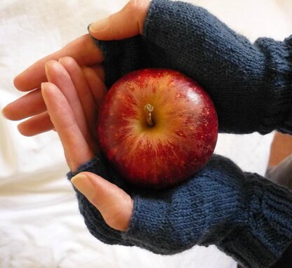 The gloves are textured with moss stitch and cables, giving them a somewhat rustic look that suits both men and women. They can easily be turned into full gloves by lengthening the fingers, if you prefer.