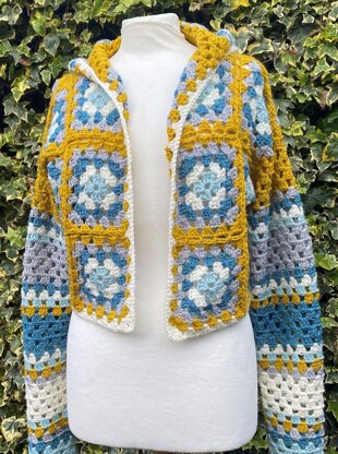The pieces are joined as you go, so there’s no seaming afterwards. The sleeves are worked in the round downwards from the shoulder to the cuff. The hood is worked upwards in one piece and there’s a short seam to close the top of the hood. This seam is worked in ss and can’t be seen, even when the hood is down. This pattern is great for using up yarn scraps.
