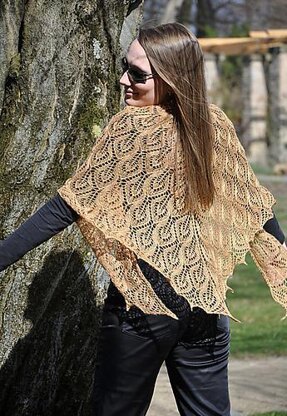 A beautiful airy triangular lace shawl with a central spine and undulating leaves.